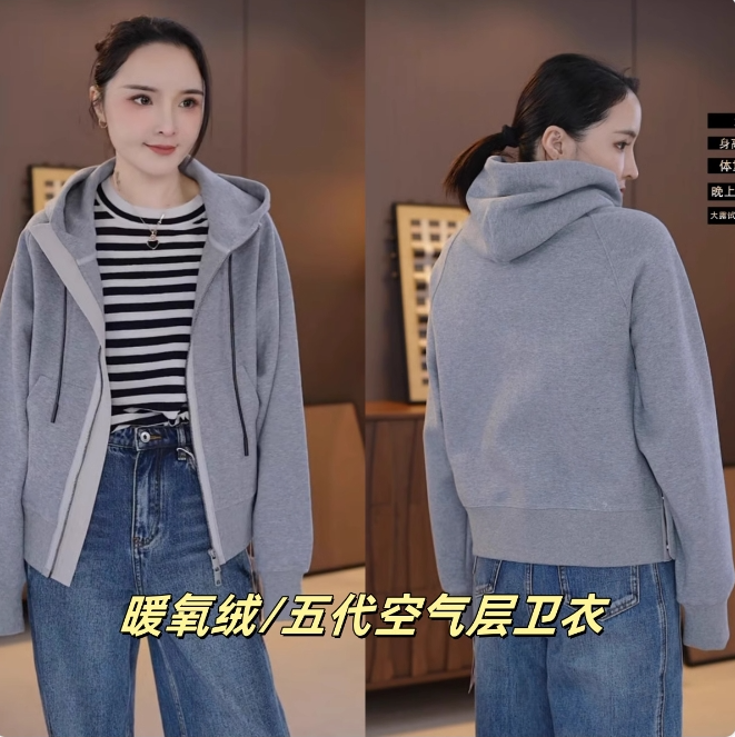 感拉链女戴帽长袖抓绒卫衣外套上衣